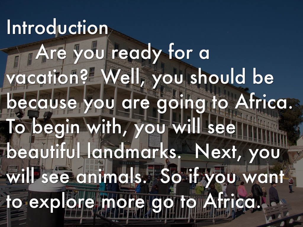 Introduction Are you ready for a vacation? Well, you should be because you are going to Africa. To begin with, you will see beautiful landmarks. Next, you will see animals. So if you want to explore more go to Africa.
