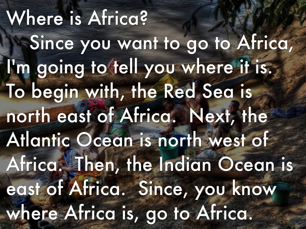 Where is Africa? Since you want to go to Africa, I'm going to tell you where it is. To begin with, the Red Sea is north east of Africa. Next, the Atlantic Ocean is north west of Africa. Then, the Indian Ocean is east of Africa. Since, you know where Africa is, go to Africa.