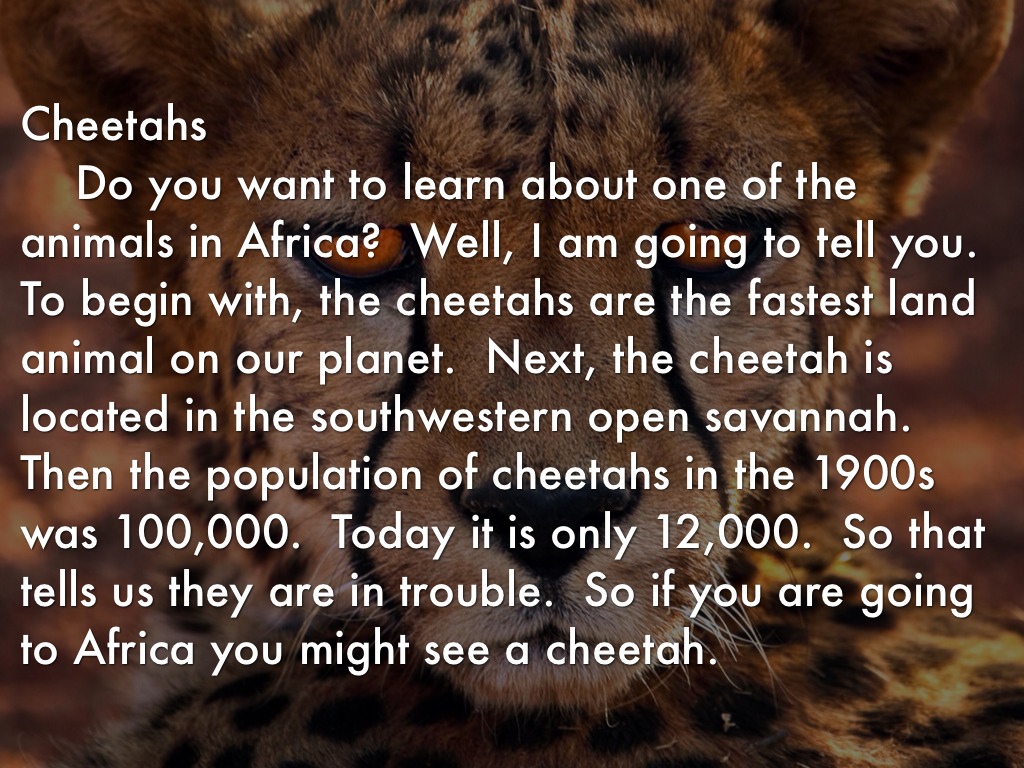 Cheetahs Do you want to learn about one of the animals in Africa? Well, I am going to tell you. To begin with, the cheetahs are the fastest land animal on our planet. Next, the cheetah is located in the southwestern open savannah. Then the population of cheetahs in the 1900s was 100,000. Today it is only 12,000. So that tells us they are in trouble. So if you are going to Africa you might see a cheetah.