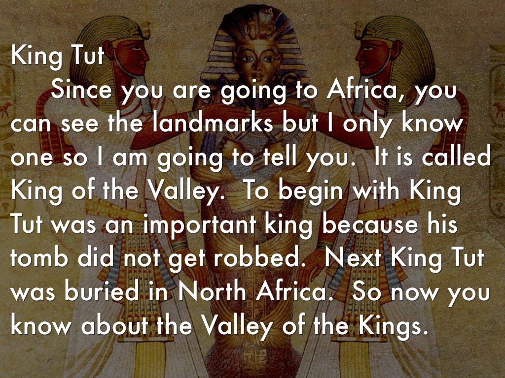 King Tut Since you are going to Africa, you can see the landmarks but I only know one so I am going to tell you. It is called King of the Valley. To begin with King Tut was an important king because his tomb did not get robbed. Next King Tut was buried in North Africa. So now you know about the Valley of the Kings.