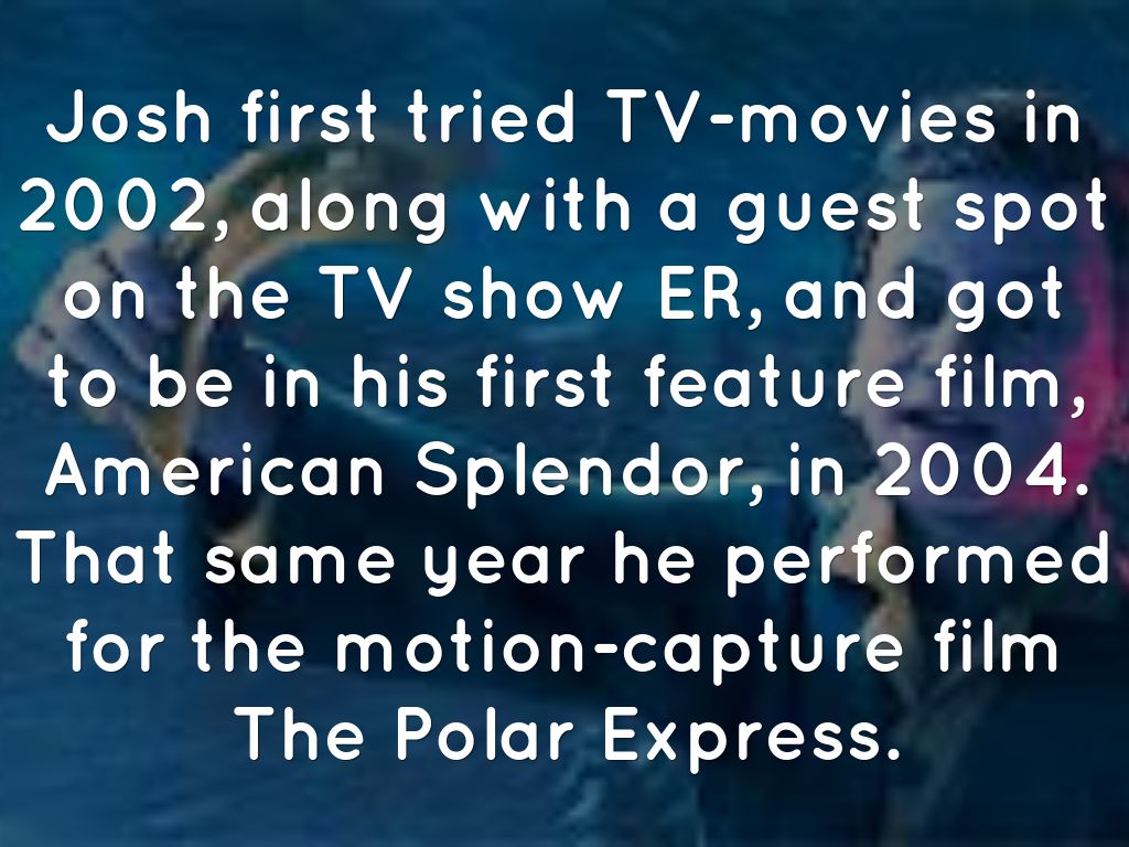 Josh first tried TV-movies in 2002, along with a guest spot on the TV show ER, and got to be in his first feature film, American Splendor, in 2004. That same year he performed for the motion-capture film The Polar Express.
