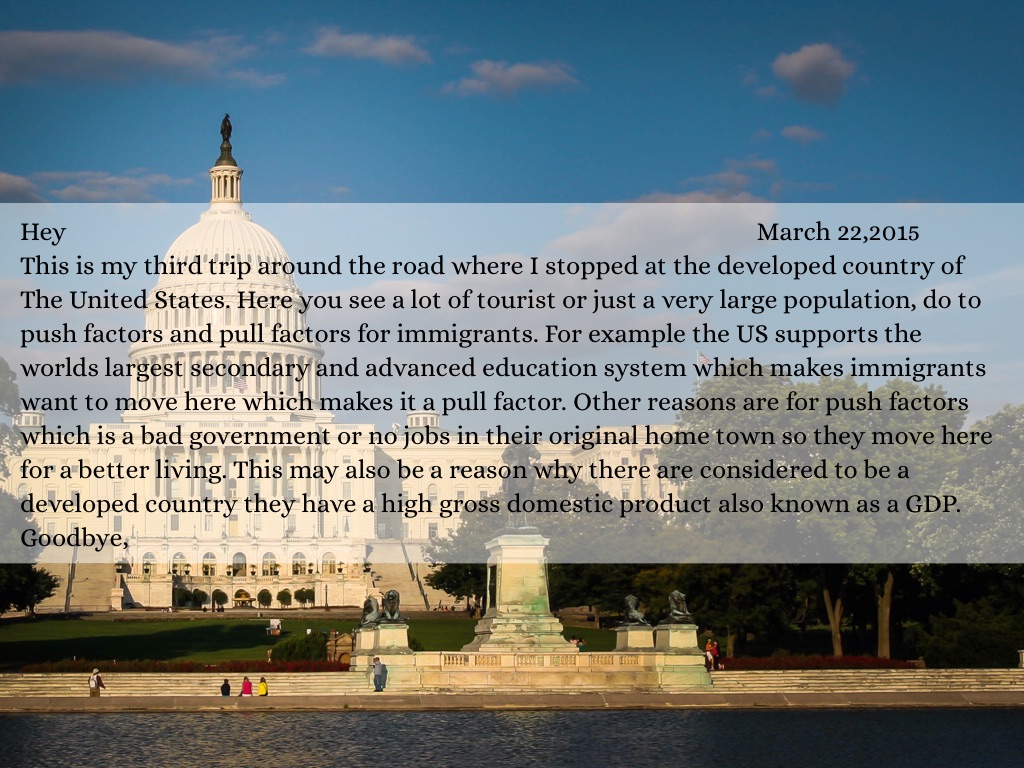 This is my third trip around the road where I stopped at the developed country of The United States. Here you see a lot of tourist or just a very large population, do to push factors and pull factors for immigrants. For example the US supports the worlds largest secondary and advanced education system which makes immigrants want to move here which makes it a pull factor. Other reasons are for push factors which is a bad government or no jobs in their original home town so they move here for a better living. This may also be a reason why there are considered to be a developed country they have a high gross domestic product also known as a GDP.
