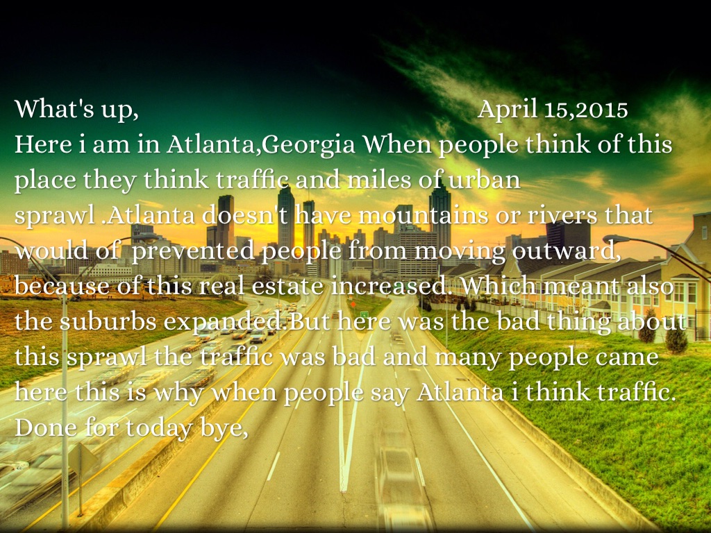 Here i am in Atlanta,Georgia When people think of this place they think traffic and miles of urban sprawl .Atlanta doesn't have mountains or rivers that would of prevented people from moving outward, because of this real estate increased. Which meant also the suburbs expanded.But here was the bad thing about this sprawl the traffic was bad and many people came here this is why when people say Atlanta i think traffic.