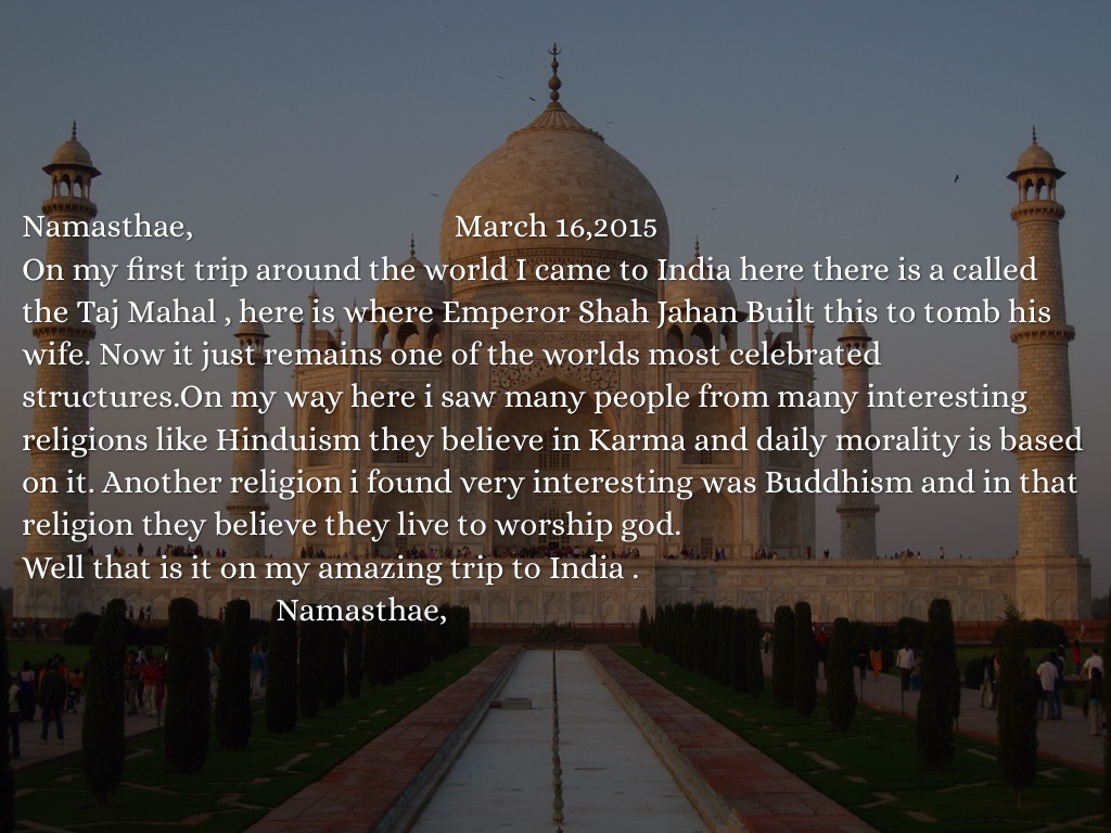 On my first trip around the world I came to India here there is a called the Taj Mahal , here is where Emperor Shah Jahan Built this to tomb his wife. Now it just remains one of the worlds most celebrated structures.On my way here i saw many people from many interesting religions like Hinduism they believe in Karma and daily morality is based on it. Another religion i found very interesting was Buddhism and in that religion they believe they live to worship god.