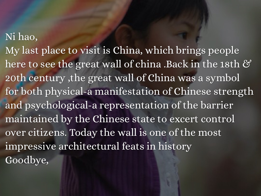 My last place to visit is China, which brings people here to see the great wall of china .Back in the 18th & 20th century ,the great wall of China was a symbol for both physical-a manifestation of Chinese strength and psychological-a representation of the barrier maintained by the Chinese state to excert control over citizens. Today the wall is one of the most impressive architectural feats in history