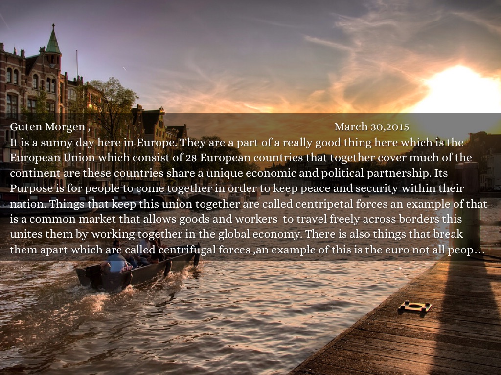 It is a sunny day here in Europe. They are a part of a really good thing here which is the European Union which consist of 28 European countries that together cover much of the continent are these countries share a unique economic and political partnership. Its Purpose is for people to come together in order to keep peace and security within their nation. Things that keep this union together are called centripetal forces an example of that is a common market that allows goods and workers to travel freely across borders this unites them by working together in the global economy. There is also things that break them apart which are called centrifugal forces ,an example of this is the euro not all people agreed on this currency.
