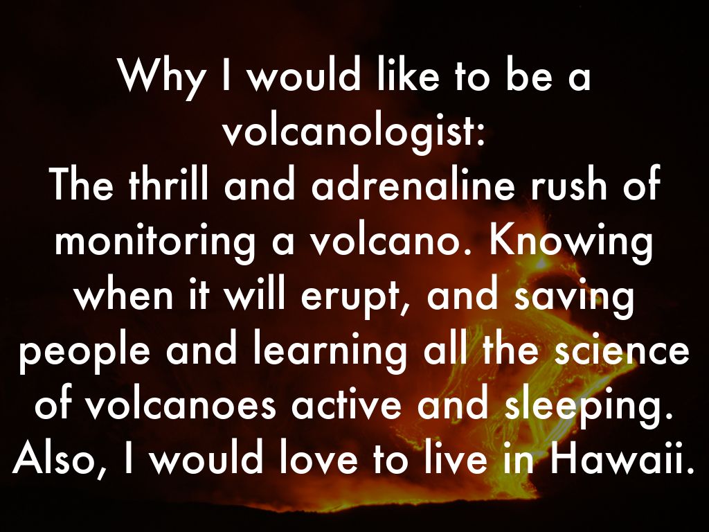 Why I would like to be a volcanologist: The thrill and adrenaline rush of monitoring a volcano. Knowing when it will erupt, and saving people and learning all the science of volcanoes active and sleeping. Also, I would love to live in Hawaii.