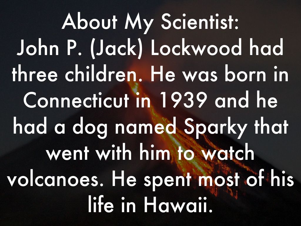 About My Scientist: John P. (Jack) Lockwood had three children. He was born in Connecticut in 1939 and he had a dog named Sparky that went with him to watch volcanoes. He spent most of his life in Hawaii.