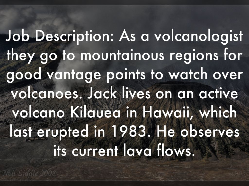 Job Description: As a volcanologist they go to mountainous regions for good vantage points to watch over volcanoes. Jack lives on an active volcano Kilauea in Hawaii, which last erupted in 1983. He observes its current lava flows.
