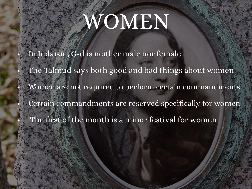 • There can be no doubt, however, that the Talmud also has many negative things to say about women. Various rabbis at various times describe women as lazy, jealous, vain and gluttonous, prone to gossip and particularly prone to the occult and witchcraft. Men are repeatedly advised against associating with women, although this is usually because of man's lust rather than because of any shortcoming in women. It is worth noting that the Talmud also has negative things to say about men, frequently describing men as particularly prone to lust and forbidden sexual desires