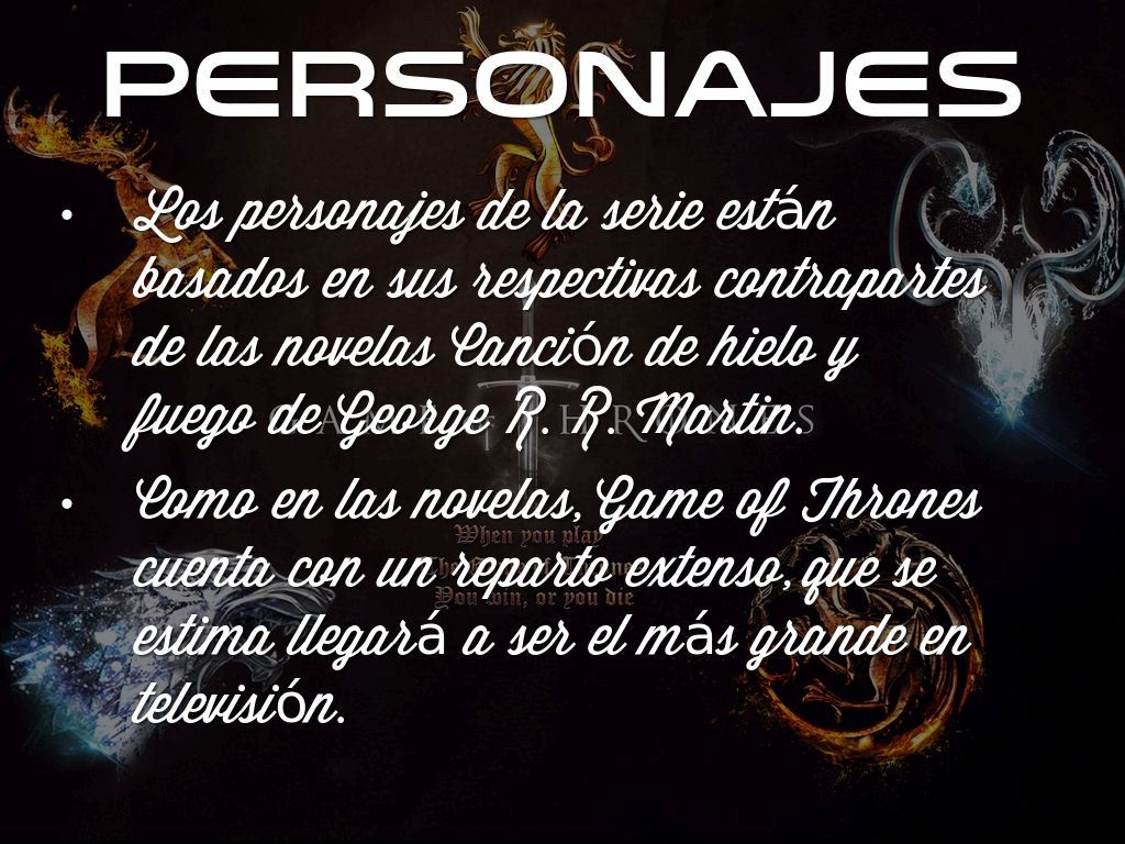 Los personajes de la serie están basados en sus respectivas contrapartes de las novelas Canción de hielo y fuego de George R. R. Martin.