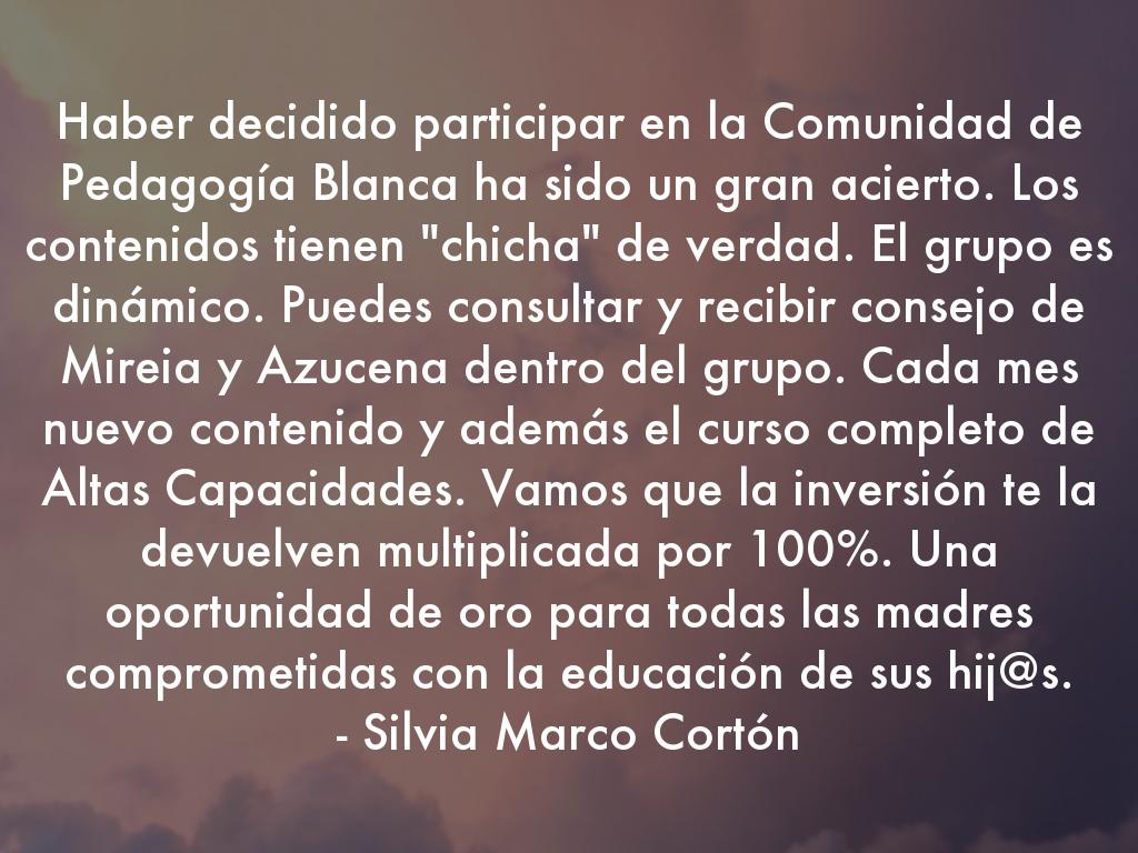 Haber decidido participar en la Comunidad de Pedagogía Blanca ha sido un gran acierto. Los contenidos tienen "chicha" de verdad. El grupo es dinámico. Puedes consultar y recibir consejo de Mireia y Azucena dentro del grupo. Cada mes nuevo contenido y además el curso completo de Altas Capacidades. Vamos que la inversión te la devuelven multiplicada por 100%. Una oportunidad de oro para todas las madres comprometidas con la educación de sus hij@s.