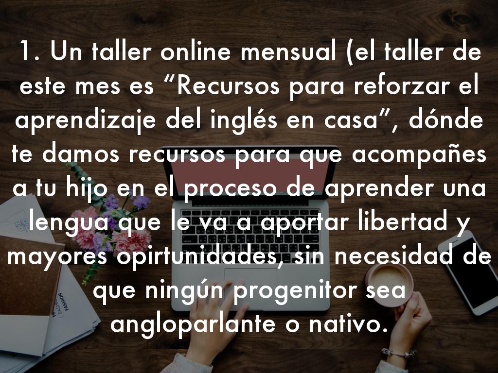 1. Un taller online mensual (el taller de este mes es “Recursos para reforzar el aprendizaje del inglés en casa”, dónde te damos recursos para que acompañes a tu hijo en el proceso de aprender una lengua que le va a aportar libertad y mayores opirtunidades, sin necesidad de que ningún progenitor sea angloparlante o nativo.