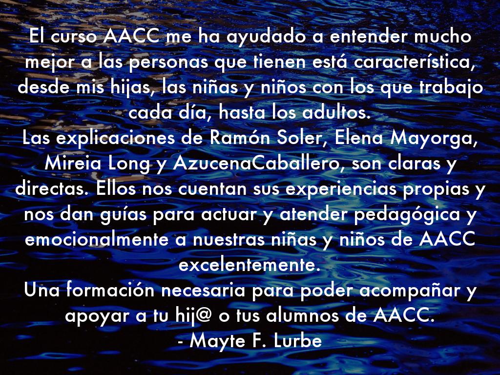 El curso AACC me ha ayudado a entender mucho mejor a las personas que tienen está característica, desde mis hijas, las niñas y niños con los que trabajo cada día, hasta los adultos.