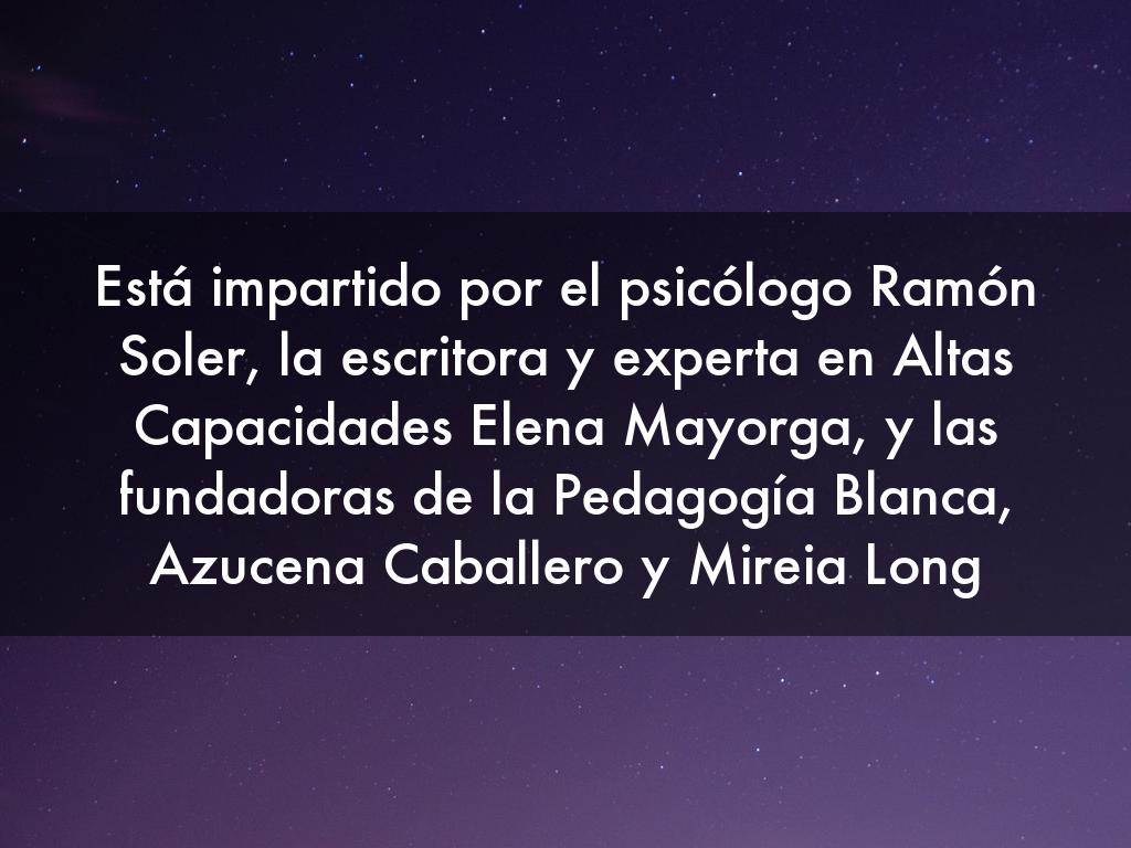 Está impartido por el psicólogo Ramón Soler, la escritora y experta en Altas Capacidades Elena Mayorga, y las fundadoras de la Pedagogía Blanca, Azucena Caballero y Mireia Long