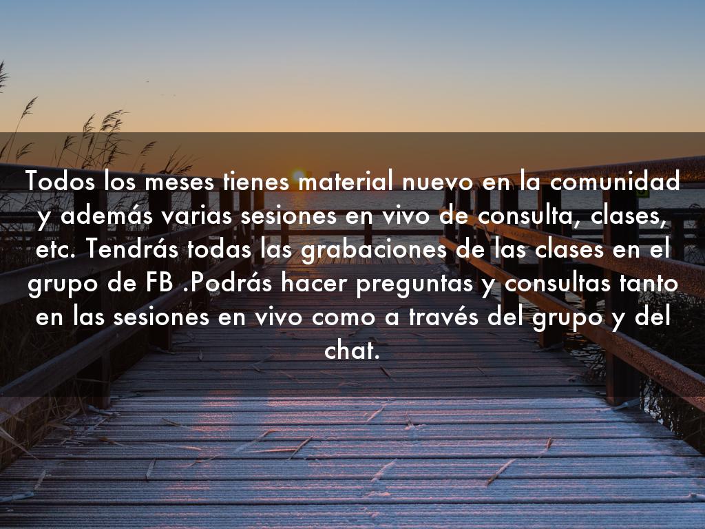 Todos los meses tienes material nuevo en la comunidad y además varias sesiones en vivo de consulta, clases, etc. Tendrás todas las grabaciones de las clases en el grupo de FB .Podrás hacer preguntas y consultas tanto en las sesiones en vivo como a través del grupo y del chat.