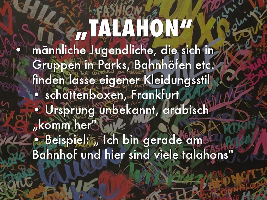 • Beispiel: „ Ich bin gerade am Bahnhof und hier sind viele talahons"