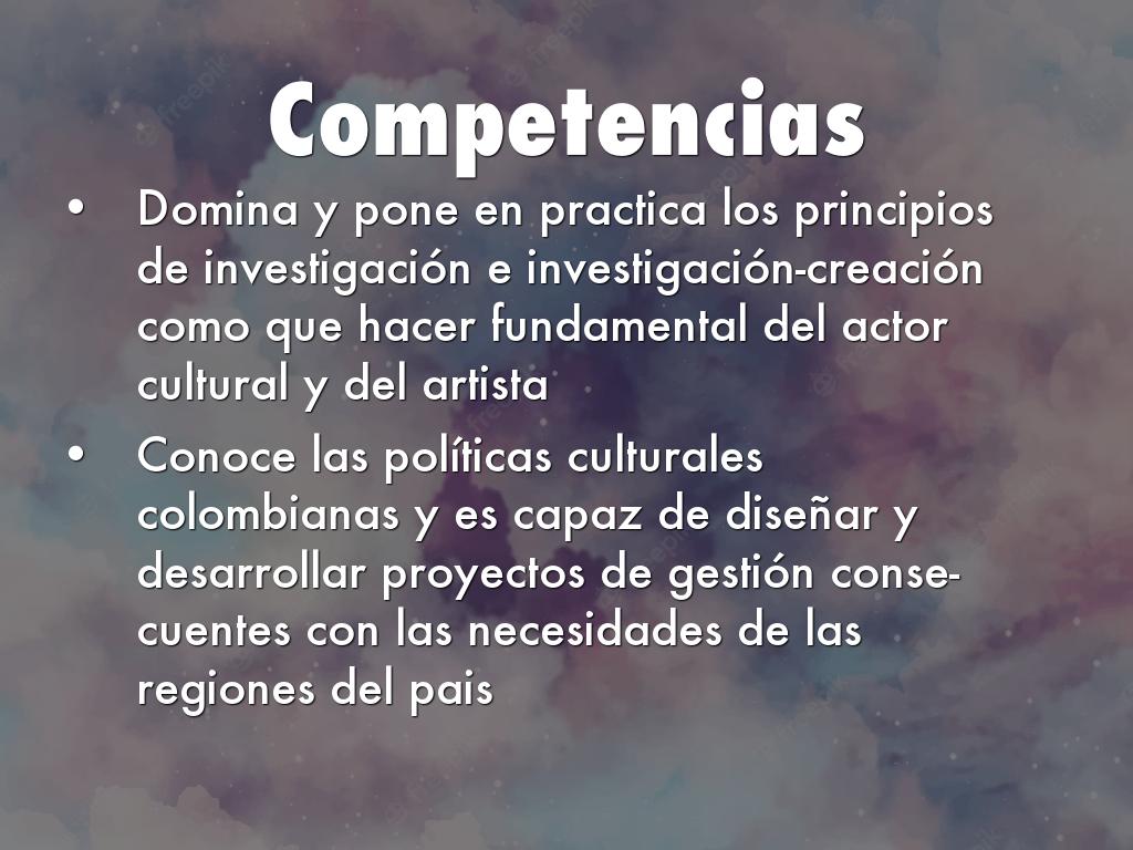 Conoce las políticas culturales colombianas y es capaz de diseñar y desarrollar proyectos de gestión conse-cuentes con las necesidades de las regiones del pais