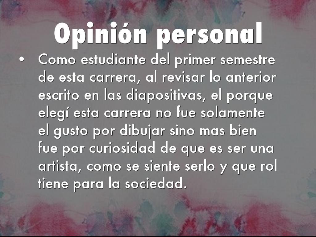 Como estudiante del primer semestre de esta carrera, al revisar lo anterior escrito en las diapositivas, el porque elegí esta carrera no fue solamente el gusto por dibujar sino mas bien fue por curiosidad de que es ser una artista, como se siente serlo y que rol tiene para la sociedad.