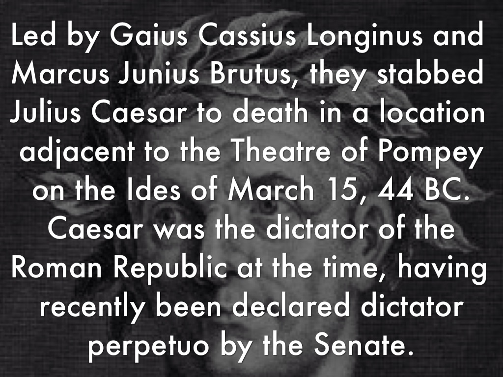 Led by Gaius Cassius Longinus and Marcus Junius Brutus, they stabbed Julius Caesar to death in a location adjacent to the Theatre of Pompey on the Ides of March 15, 44 BC. Caesar was the dictator of the Roman Republic at the time, having recently been declared dictator perpetuo by the Senate.