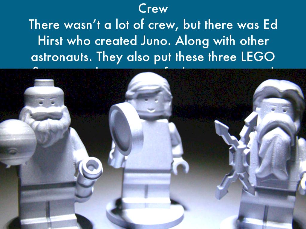 There wasn’t a lot of crew, but there was Ed Hirst who created Juno. Along with other astronauts. They also put these three LEGO figures on the spacecraft, they represented gods/goddesses.