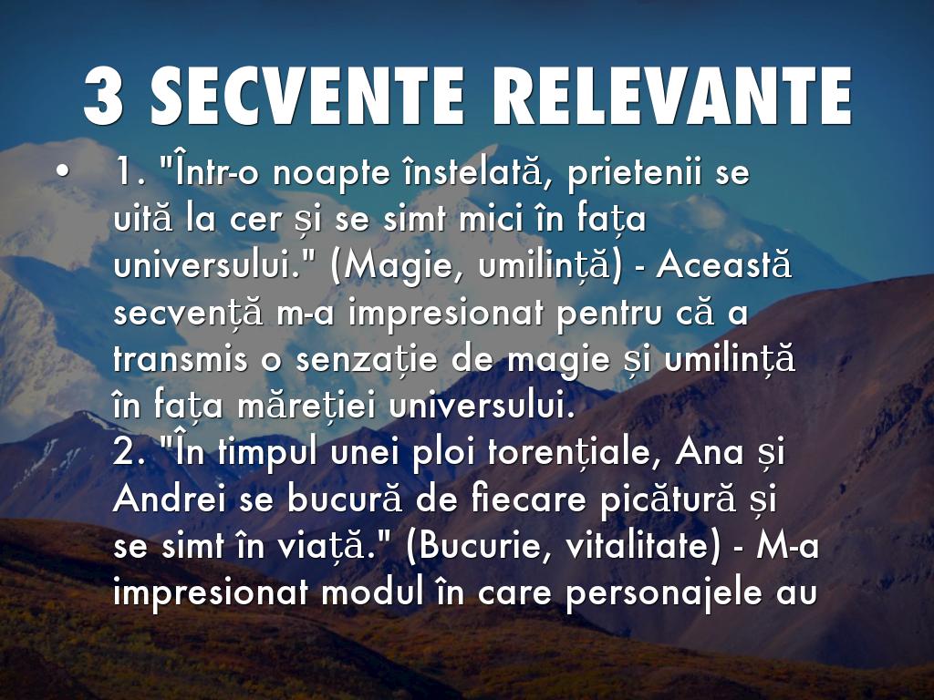 1. "Într-o noapte înstelată, prietenii se uită la cer și se simt mici în fața universului." (Magie, umilință) - Această secvență m-a impresionat pentru că a transmis o senzație de magie și umilință în fața măreției universului.
