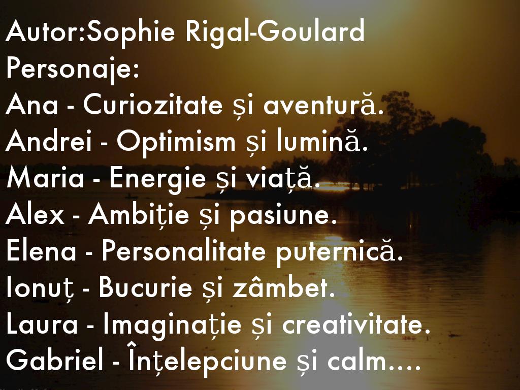 Autor:Sophie Rigal-Goulard Personaje: Ana - Curiozitate și aventură. Andrei - Optimism și lumină. Maria - Energie și viață. Alex - Ambiție și pasiune. Elena - Personalitate puternică. Ionuț - Bucurie și zâmbet. Laura - Imaginație și creativitate. Gabriel - Înțelepciune și calm.…