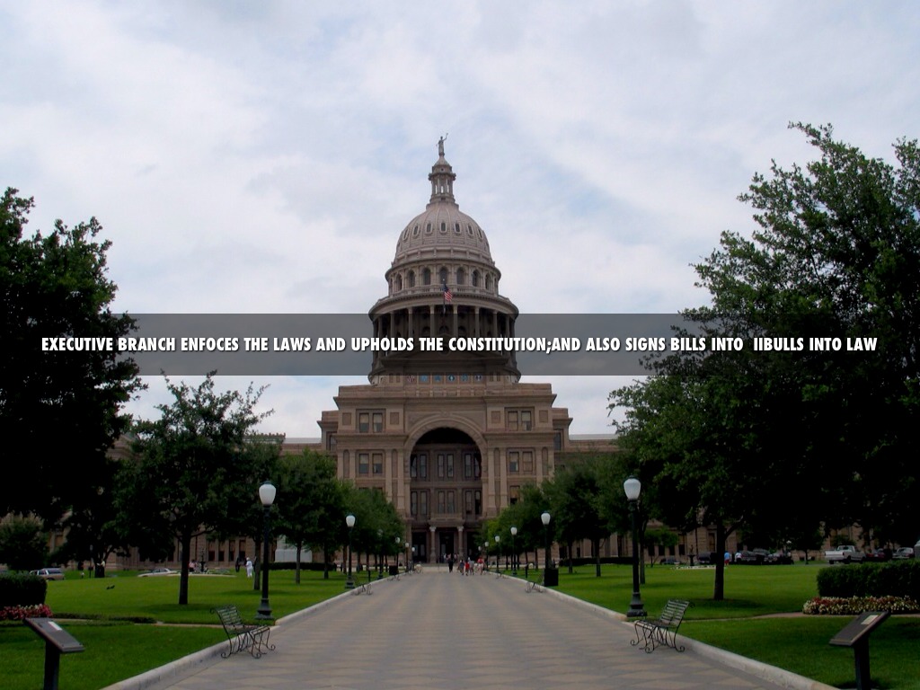 EXECUTIVE BRANCH ENFOCES THE LAWS AND UPHOLDS THE CONSTITUTION;AND ALSO SIGNS BILLS INTO IIBULLS INTO LAW