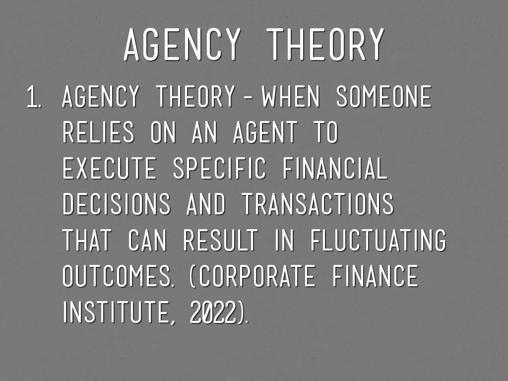 • agency theory-when someone relies on an agent to execute specific financial decisions and transactions that can result in fluctuating outcomes. (corporate finance institute, 2022).