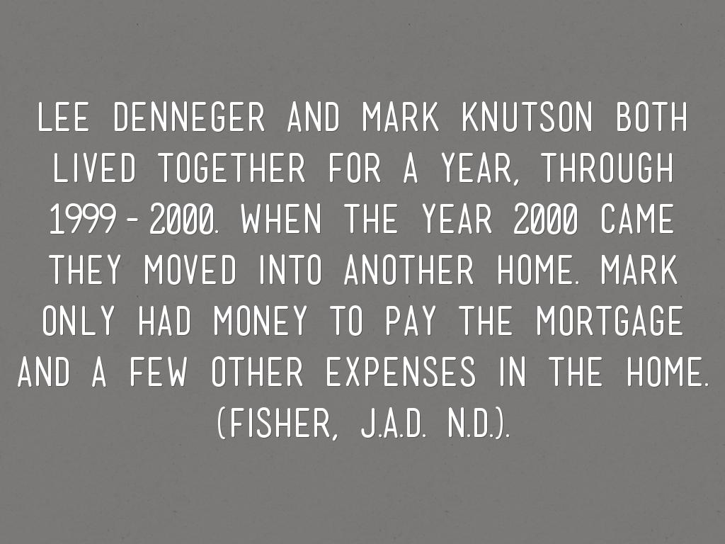 lEE dENNEGER AND mARK kNUTSON BOTH LIVED TOGETHER FOR A YEAR, THROUGH 1999-2000. wHEN THE YEAR 2000 CAME THEY MOVED INTO ANOTHER HOME. mARK ONLY HAD MONEY TO PAY THE MORTGAGE AND A FEW OTHER EXPENSES IN THE HOME. (fisher, J.A.D. n.d.).