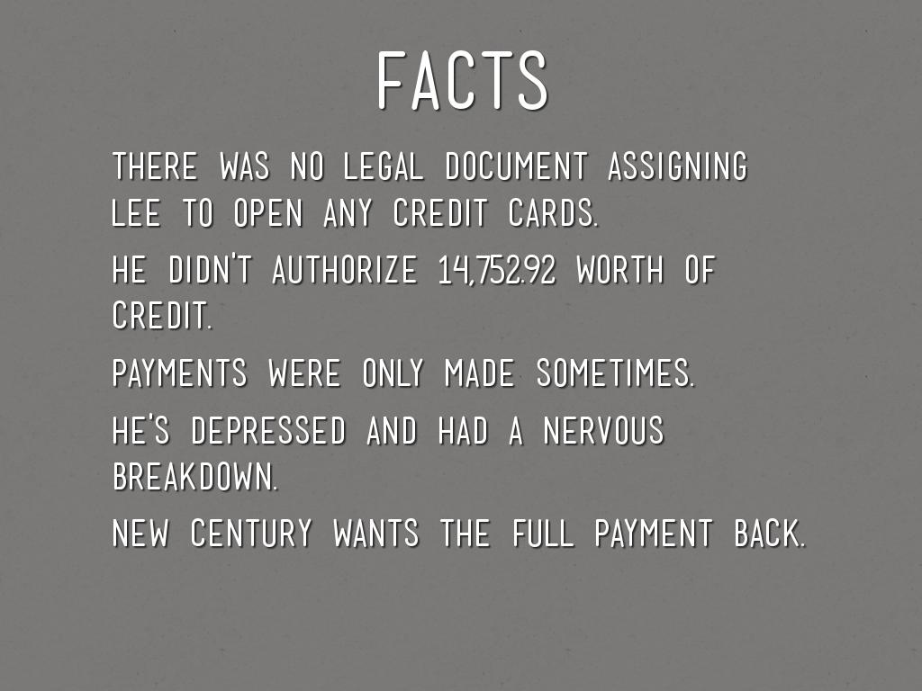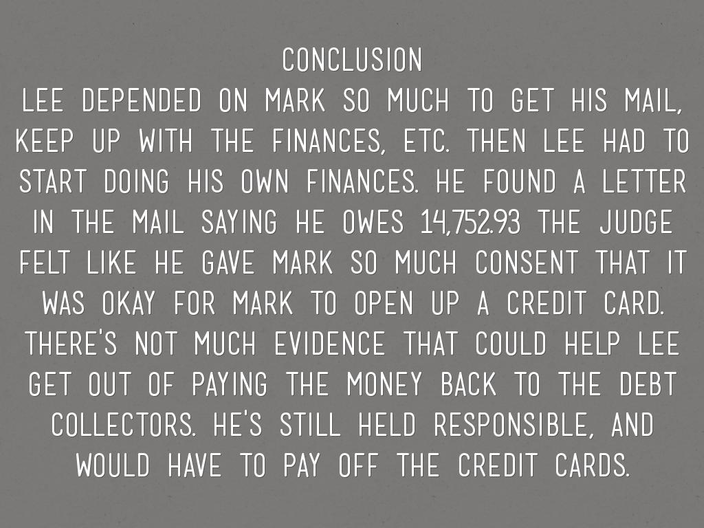 lee depended on mark so much to get his mail, keep up with the finances, etc. then lee had to start doing his own finances. he found a letter in the mail saying he owes 14,752.93 the judge felt like he gave mark so much consent that it was okay for mark to open up a credit card. there's not much evidence that could help lee get out of paying the money back to the debt collectors. he's still held responsible, and would have to pay off the credit cards.
