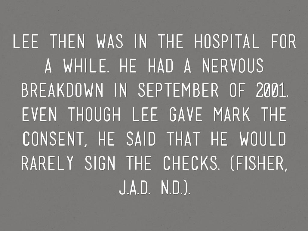 LEE THEN WAS IN THE HOSPITAL FOR A WHILE. hE HAD A NERVOUS BREAKDOWN IN SEPTEMBER OF 2001. eVEN THOUGH LEE GAVE MARK THE CONSENT, HE SAID THAT HE WOULD RARELY SIGN THE CHECKS. (fisher, J.A.D. n.d.).