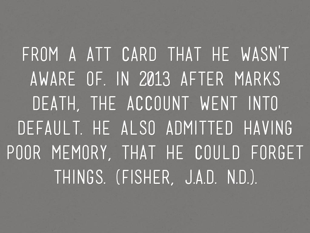 FROM A ATT CARD THAT HE WASN'T AWARE OF. IN 2013 AFTER MARKS DEATH, THE ACCOUNT WENT INTO DEFAULT. HE ALSO ADMITTED HAVING POOR MEMORY, THAT HE COULD FORGET THINGS. (fisher, J.A.D. n.d.).