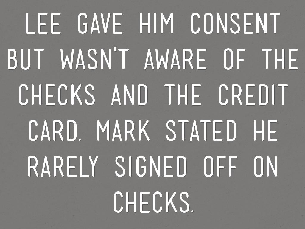 lee gave him consent but wasn't aware of the checks and the credit card. mark stated he rarely signed off on checks.