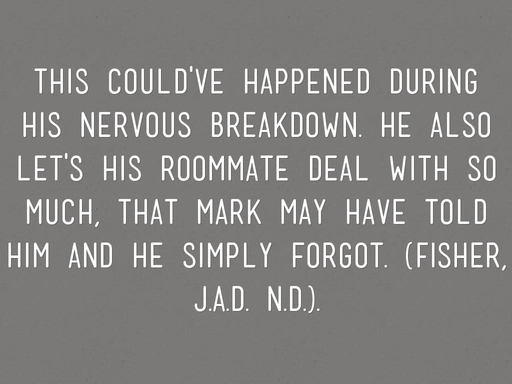 THIS COULD'VE HAPPENED DURING HIS NERVOUS BREAKDOWN. HE ALSO LET'S HIS ROOMMATE DEAL WITH SO MUCH, THAT MARK MAY HAVE TOLD HIM AND HE SIMPLY FORGOT. (fisher, J.A.D. n.d.).