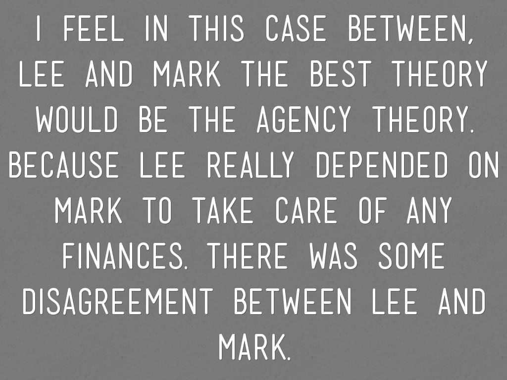 i feel in this case between, lee and mark the best theory would be the agency theory. because lee really depended on mark to take care of any finances. there was some disagreement between lee and mark.