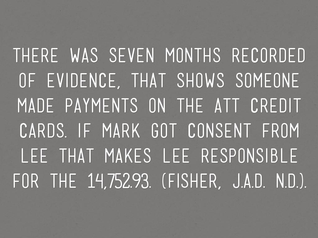 THERE WAS SEVEN MONTHS RECORDED OF EVIDENCE, THAT SHOWS SOMEONE MADE PAYMENTS ON THE ATT CREDIT CARDS. iF MARK GOT CONSENT FROM LEE THAT MAKES LEE RESPONSIBLE FOR THE 14,752.93. (fisher, J.A.D. n.d.).
