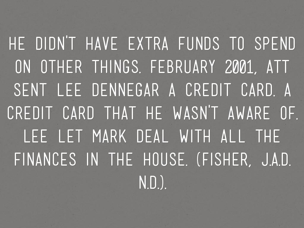 hE DIDN'T HAVE EXTRA FUNDS TO SPEND ON OTHER THINGS. fEBRUARY 2001, aTT SENT LEE dENNEGAR A CREDIT CARD. A CREDIT CARD THAT HE WASN'T AWARE OF. lEE LET MARK DEAL WITH ALL THE FINANCES IN THE HOUSE. (fisher, J.A.D. n.d.).