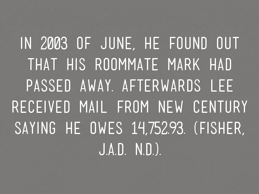 IN 2003 OF jUNE, HE FOUND OUT THAT HIS ROOMMATE MARK HAD PASSED AWAY. AFTERWARDS LEE RECEIVED MAIL FROM NEW CENTURY SAYING HE OWES 14,752.93. (fisher, J.A.D. n.d.).