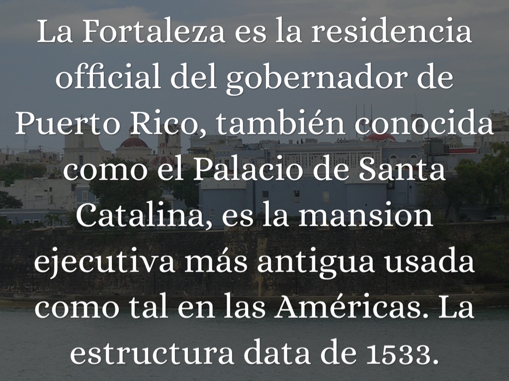 La Fortaleza es la residencia official del gobernador de Puerto Rico, también conocida como el Palacio de Santa Catalina, es la mansion ejecutiva más antigua usada como tal en las Américas. La estructura data de 1533.