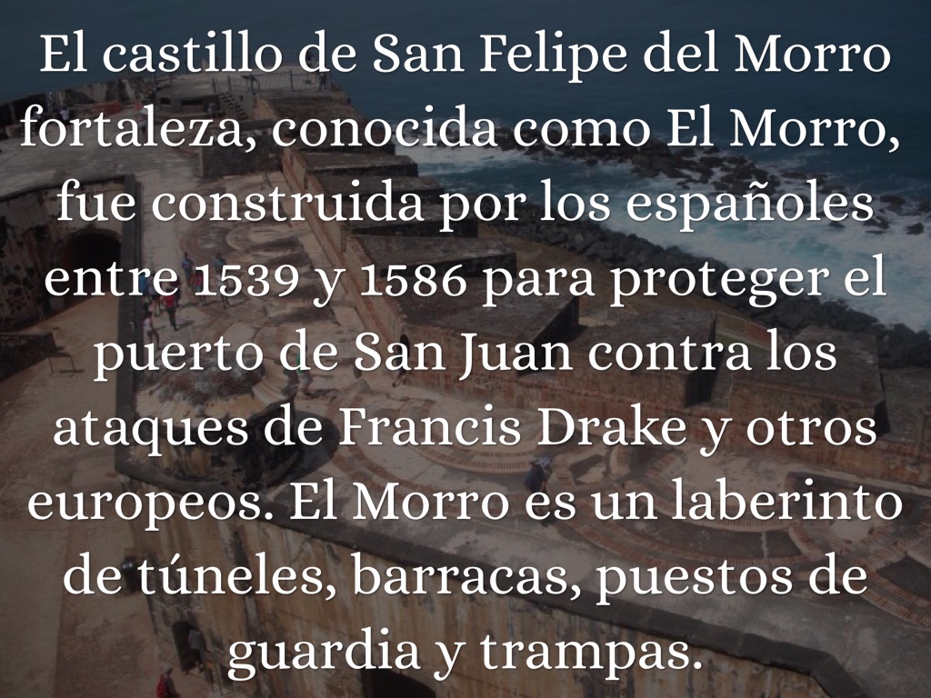 El castillo de San Felipe del Morro fortaleza, conocida como El Morro, fue construida por los españoles entre 1539 y 1586 para proteger el puerto de San Juan contra los ataques de Francis Drake y otros europeos. El Morro es un laberinto de túneles, barracas, puestos de guardia y trampas.