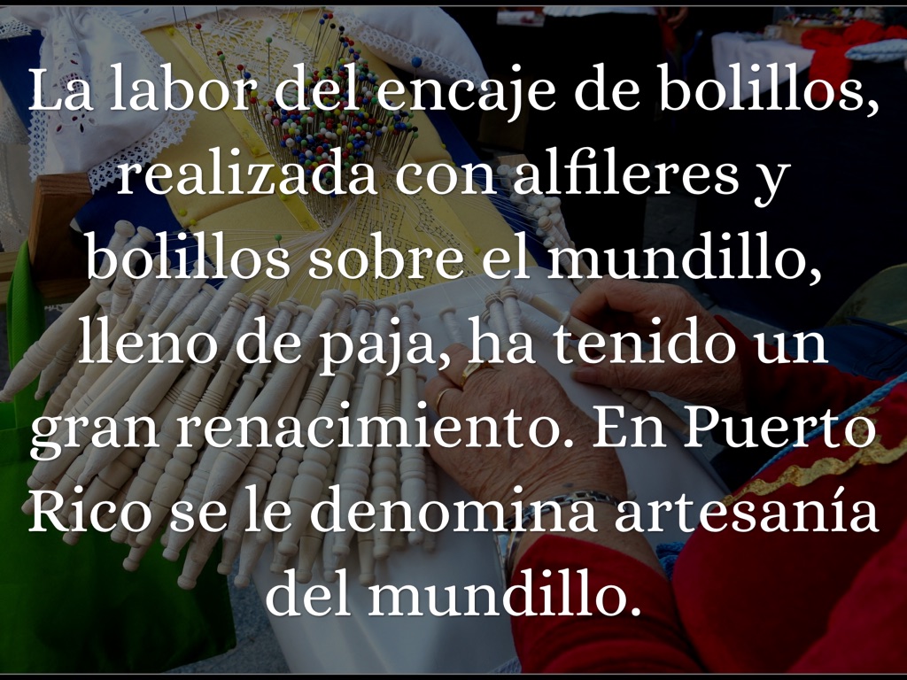 La labor del encaje de bolillos, realizada con alfileres y bolillos sobre el mundillo, lleno de paja, ha tenido un gran renacimiento. En Puerto Rico se le denomina artesanía del mundillo.