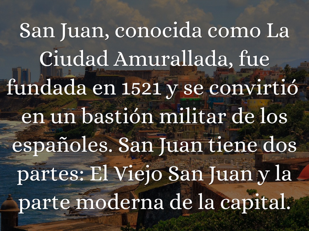 San Juan, conocida como La Ciudad Amurallada, fue fundada en 1521 y se convirtió en un bastión militar de los españoles. San Juan tiene dos partes: El Viejo San Juan y la parte moderna de la capital.