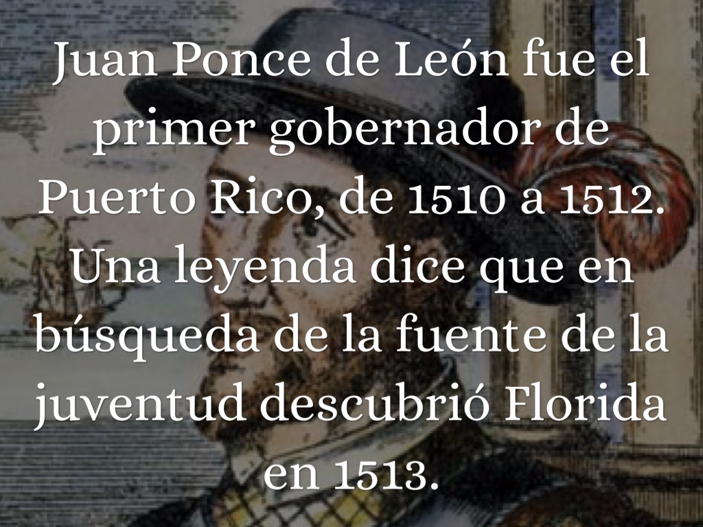 Juan Ponce de León fue el primer gobernador de Puerto Rico, de 1510 a 1512. Una leyenda dice que en búsqueda de la fuente de la juventud descubrió Florida en 1513.