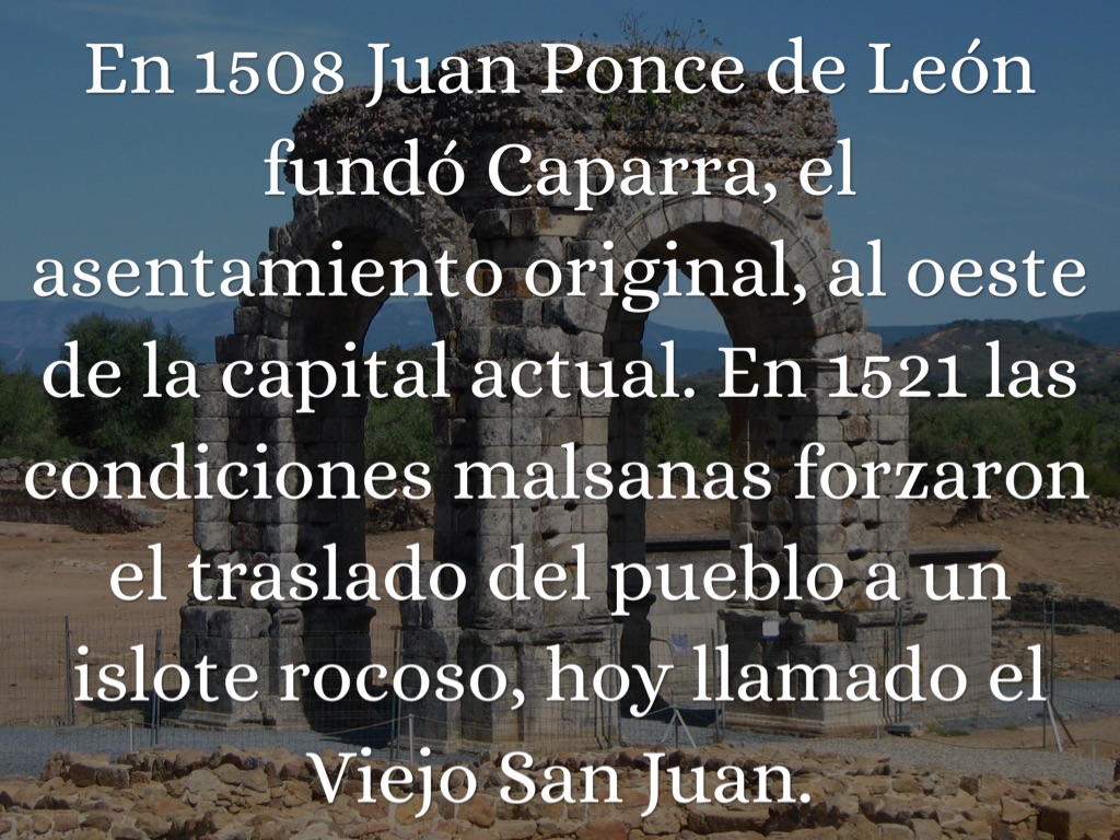 En 1508 Juan Ponce de León fundó Caparra, el asentamiento original, al oeste de la capital actual. En 1521 las condiciones malsanas forzaron el traslado del pueblo a un islote rocoso, hoy llamado el Viejo San Juan.