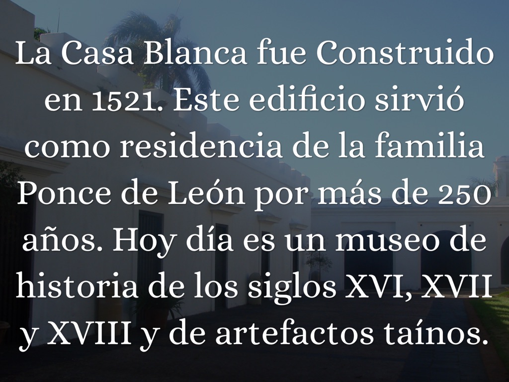 La Casa Blanca fue Construido en 1521. Este edificio sirvió como residencia de la familia Ponce de León por más de 250 años. Hoy día es un museo de historia de los siglos XVI, XVII y XVIII y de artefactos taínos.