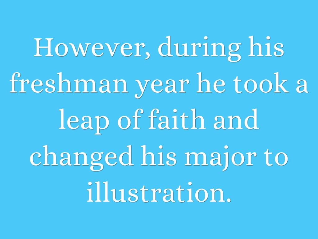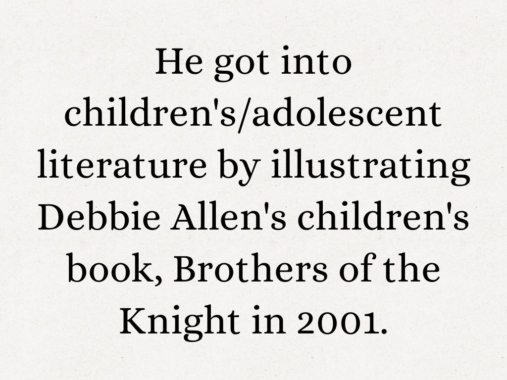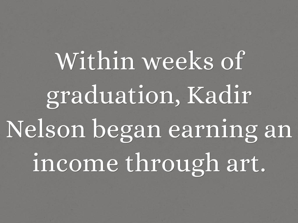 He initially enrolled at Pratt as an architecture major because he had heard how hard it was to make ends meet as an artist. During his freshman year he took a leap of faith and changed his major to illustration. Within weeks of graduation, Kadir Nelson began earning an income through art.