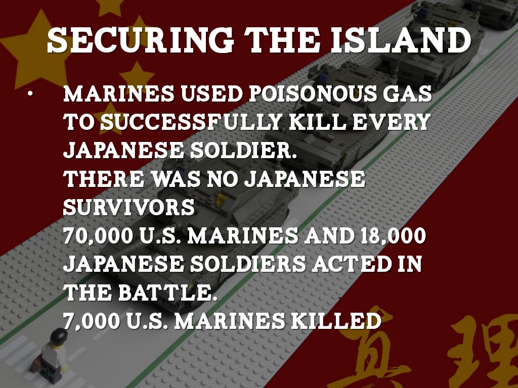 • Marines used poisonous gas to successfully kill every Japanese soldier. There was no Japanese survivors 70,000 U.S. Marines and 18,000 Japanese soldiers acted in the battle. 7,000 U.S. Marines killed