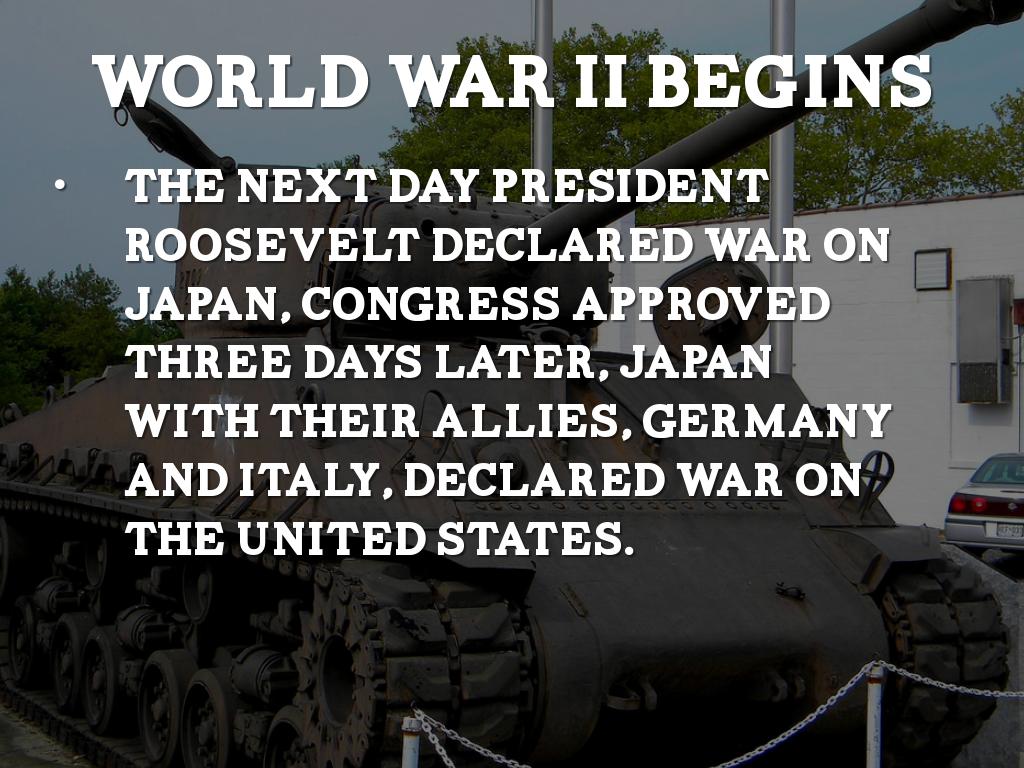 • The next day President Roosevelt declared war on Japan, Congress approved Three days later, Japan with their allies, Germany and Italy, declared war on the United States.