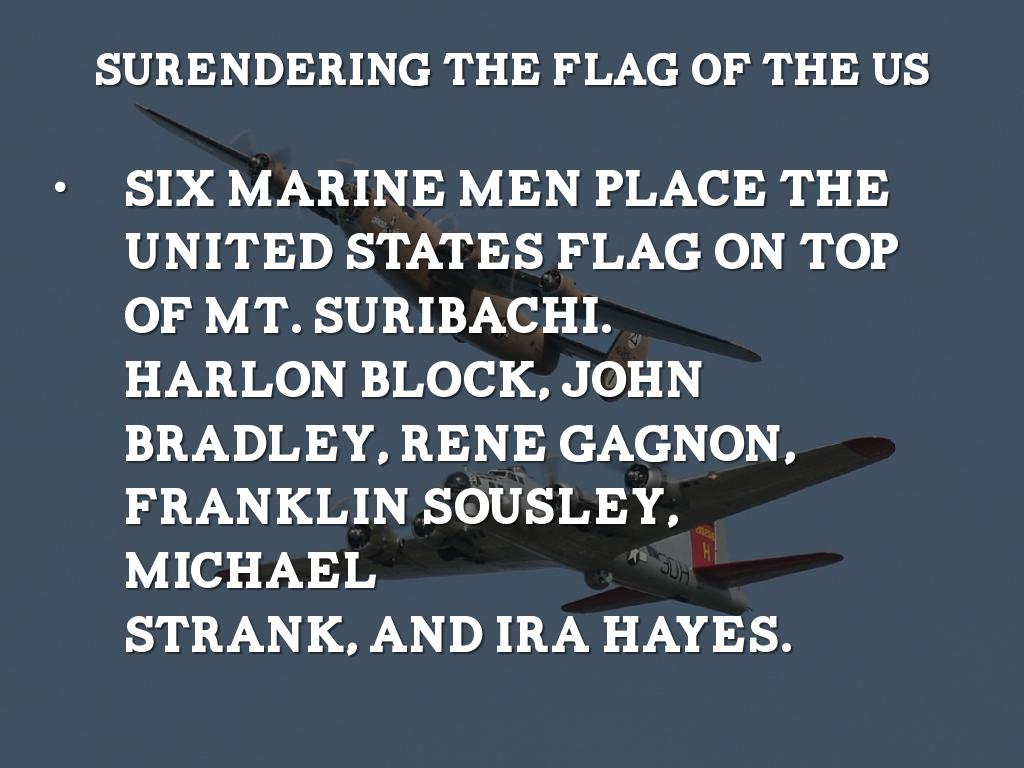 • Six Marine men place the United states flag on top of Mt. Suribachi. Harlon Block, John Bradley, Rene Gagnon, Franklin Sousley, Michael Strank, and Ira Hayes.